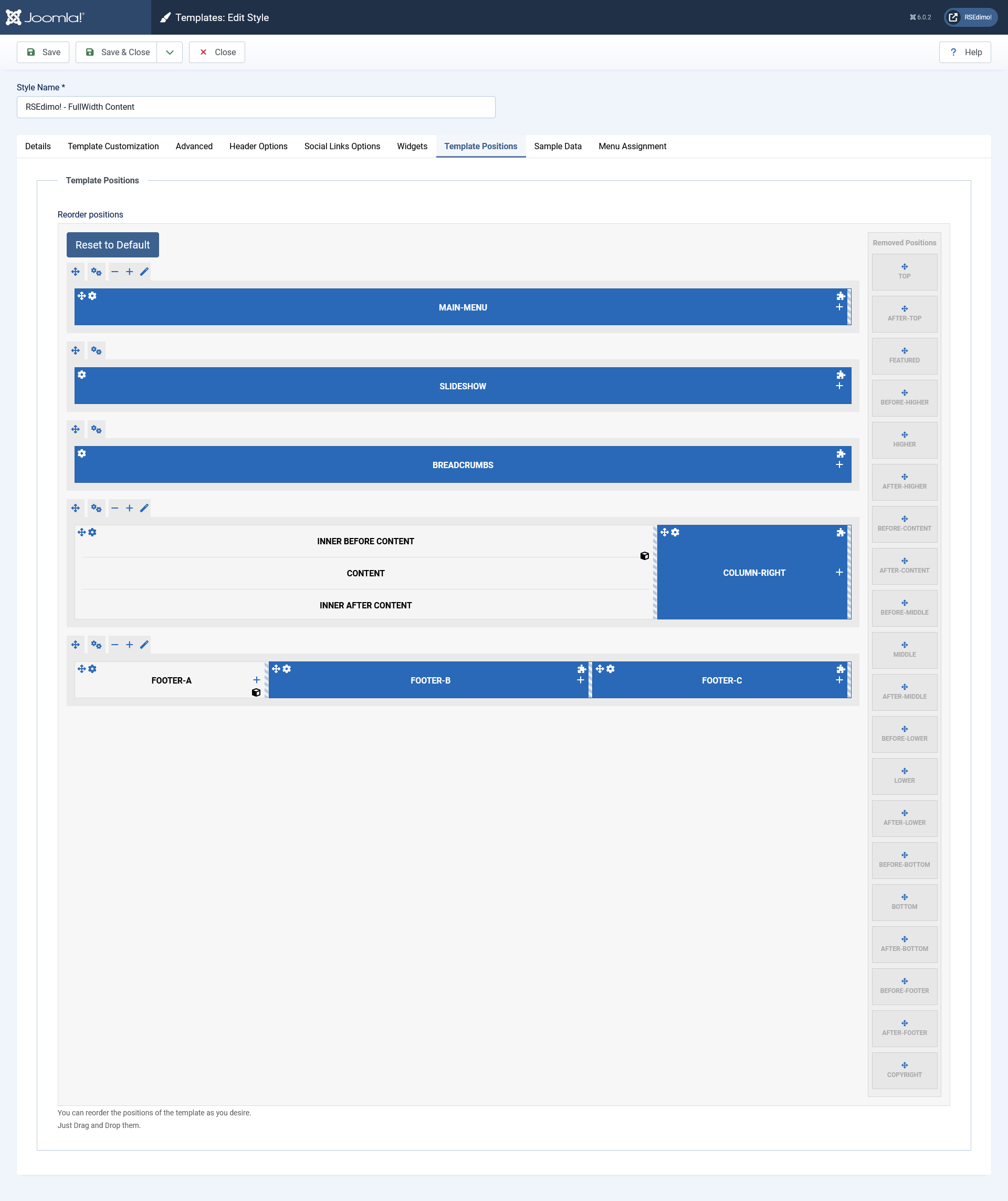The template's configurable options can be found by going to System >> Templates >> Site Template Styles and selecting RSEdimo! from the style column.