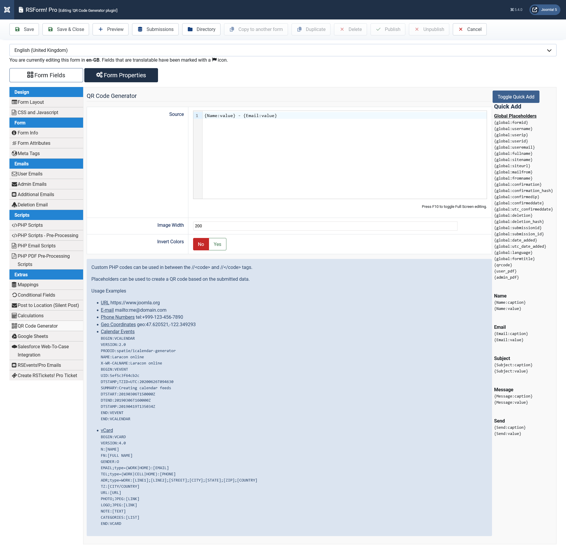 Configuring the QR Code Generator plugin can be done from Components > RSForm!Pro > Edit your form > Form Properties > QR Code Generator tab: