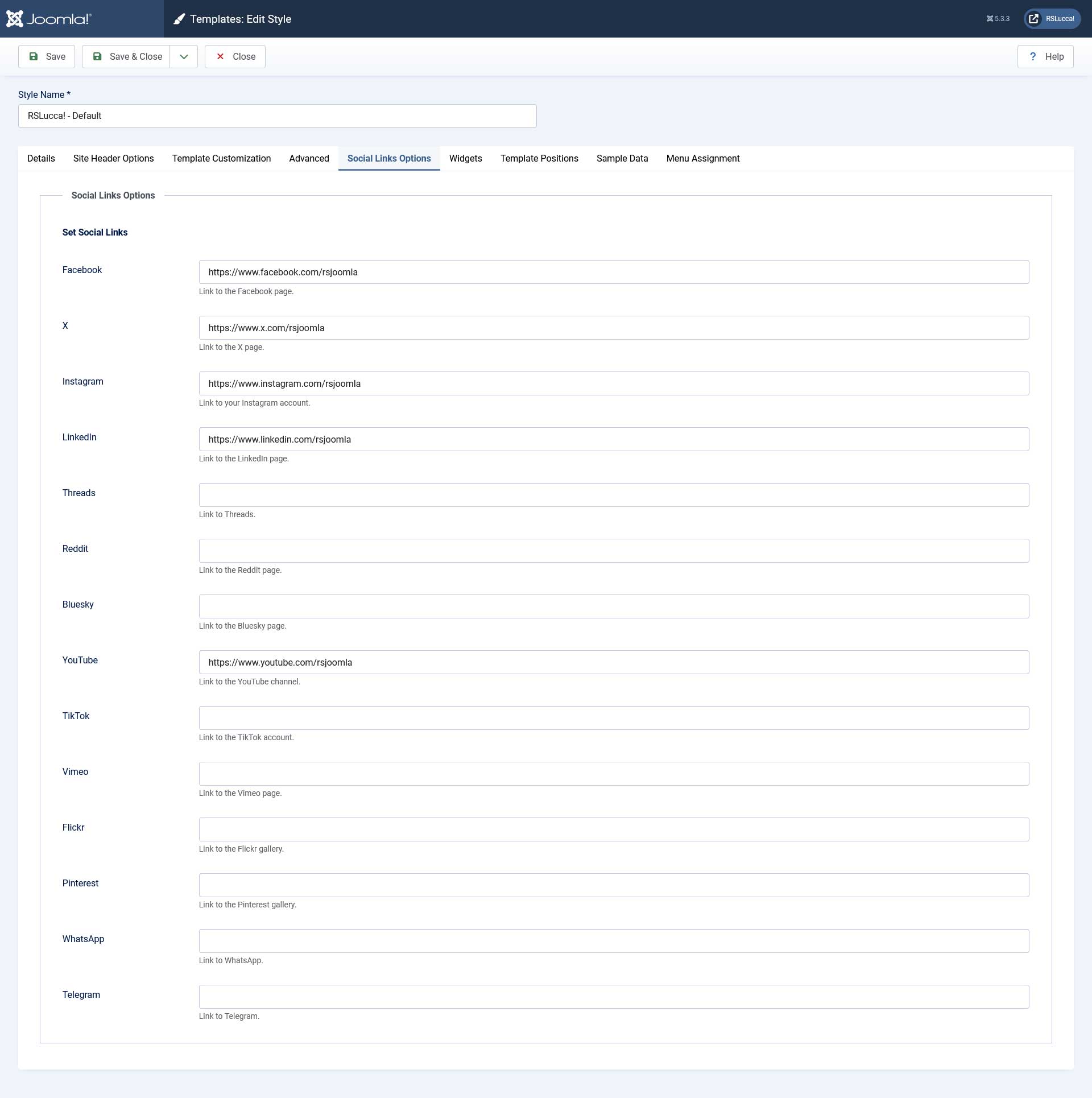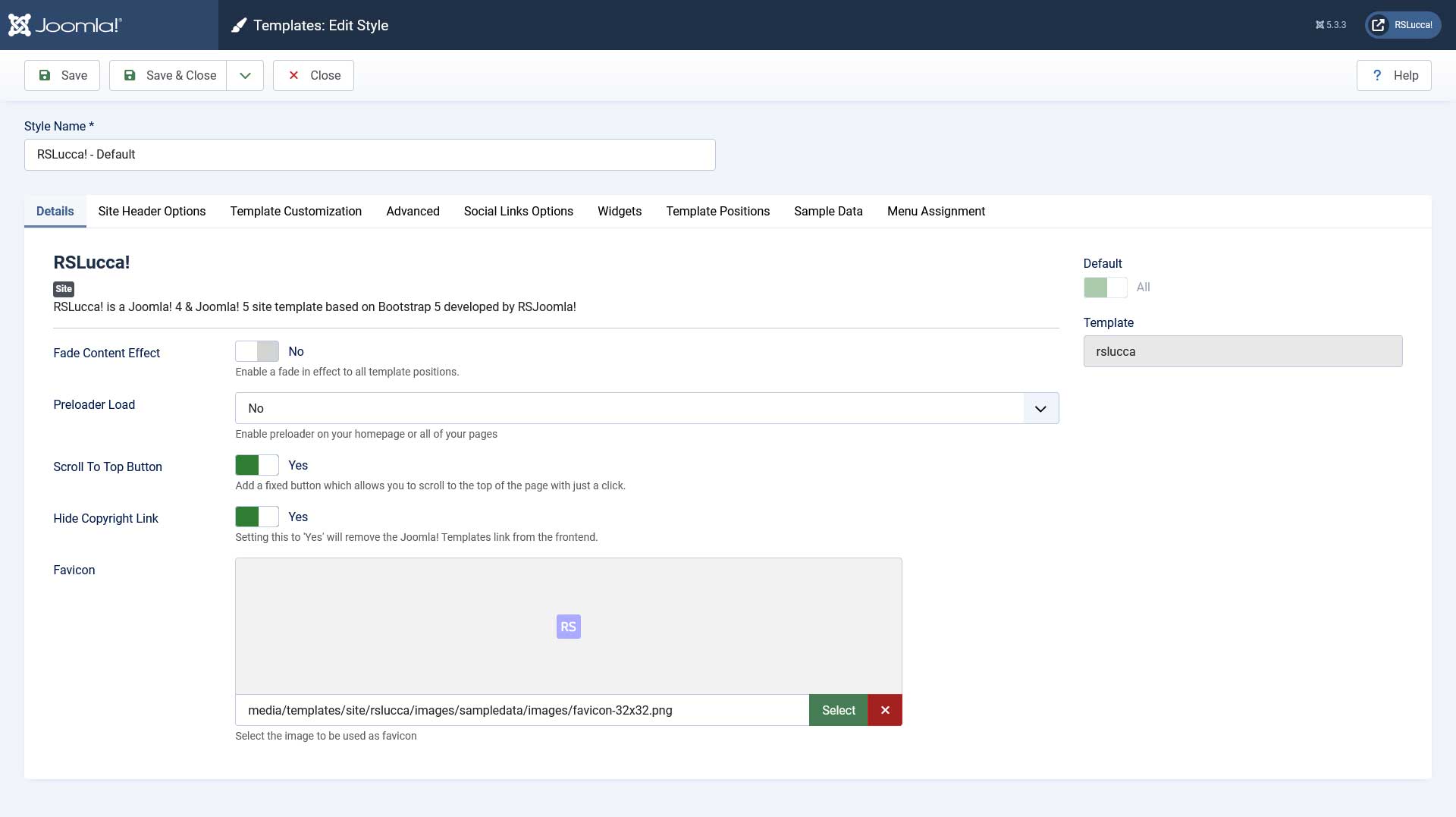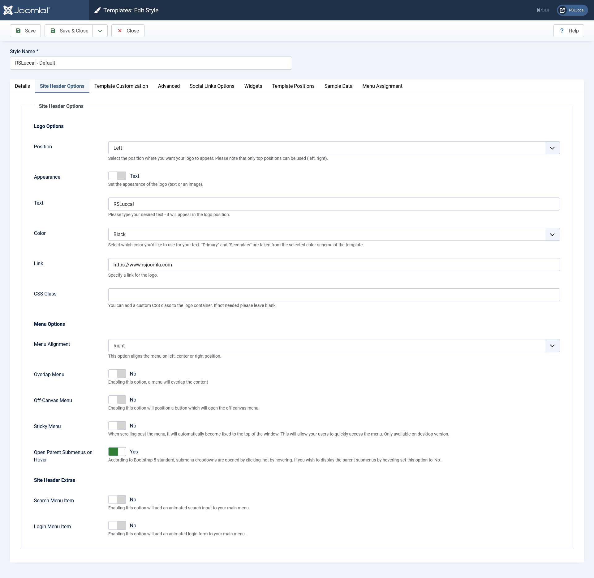 The template's configurable options can be found by going to System >> Templates >> Site Template Styles and selecting RSLucca! from the style column.