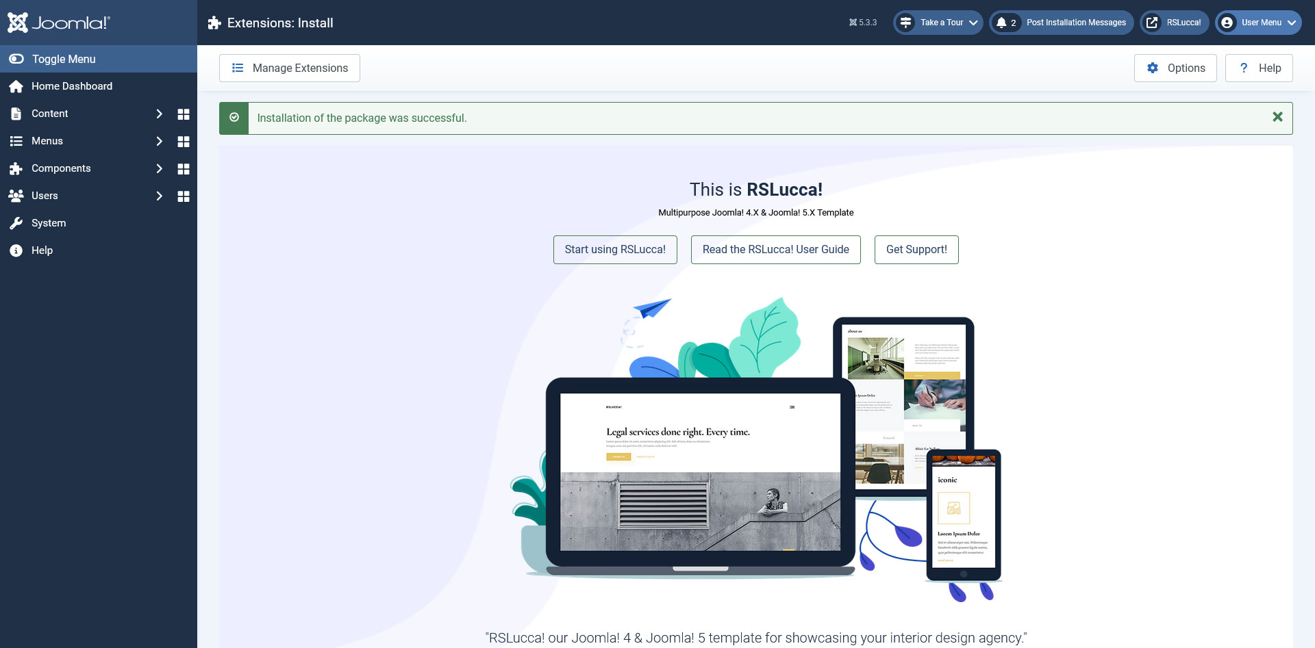 If the installation was successful, you should see the message "Installation of the package was successful." in a green box.