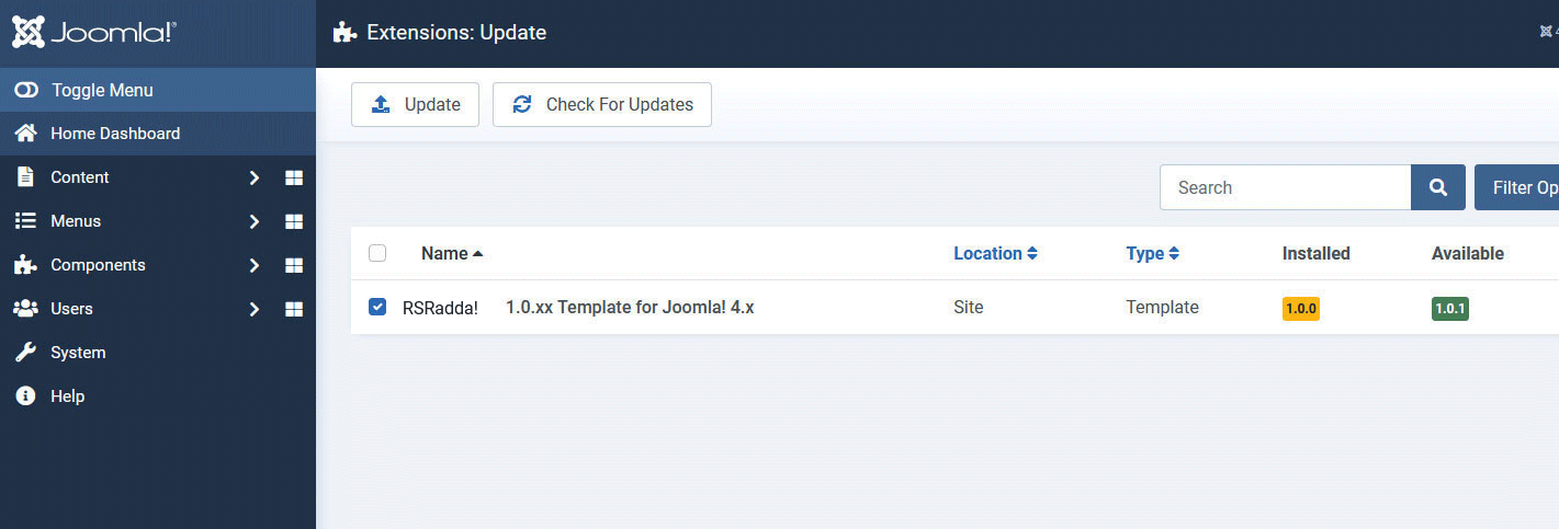 Proceed to System > Update > Extensions and click on Check For Updates. Note that every time we'll release an update of RSRadda! you will get a notification message in the administrator > control panel section of your website.